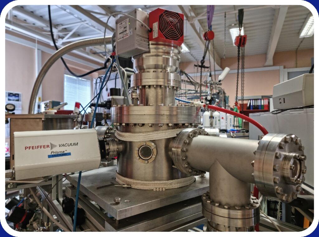 The resulting physicochemical changes in the ice layers due to irradiation are monitored by infrared spectroscopy in either transmission or reflection mode by a Bruker Vertex 70V spectrometer operating in the MIR spectral range. Optionally, the setup can be equipped with a QMS spectrometer in order to analyze the sputtered fragments (mass range: 1–300 amu) ejected from the ice during ion irradiation. Temperature-programmed desorption (TPD) studies can also be performed on both non-irradiated and irradiated ices in order to identify molecules desorbing from the ice layer.